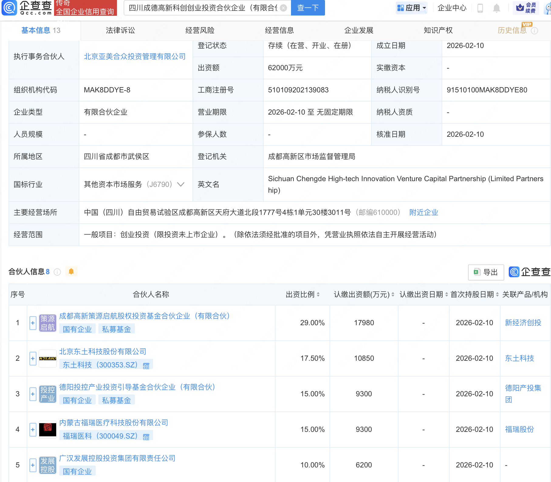 近日,四川成德高新科创创业投资合伙企业(有限合伙)成立,出资额6.2亿元,经营范围包含:创业投资(限投资未上市企业)。企查查股权穿透显示,该企业由东土科技(300353)、福瑞医科(300049)等共同出资。